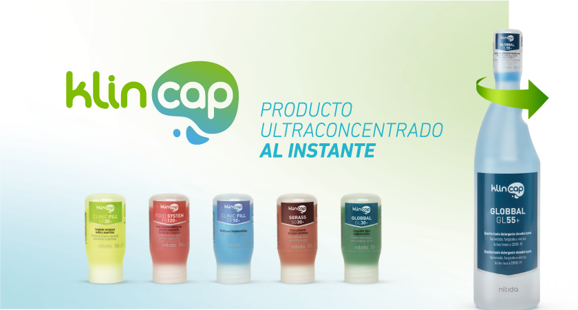 Otro de nuestros retos ha sido acercar la limpieza a la circularidad mediante Klincap, un sistema compuesto por cápsulas cuyo producto ultra concentrado se diluye en agua con tan solo un clic. Inmediatez, comodidad y seguridad cuando las necesitas. El envase es 100% reciclable.